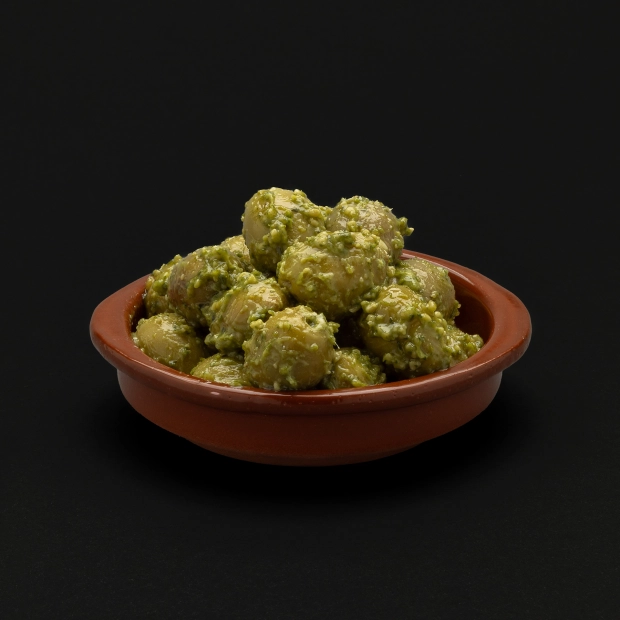 Deze knoflook pesto olijven combineren sappige olijven met de romige smaak van pesto. Ideaal als borrelsnack of als smaakmaker in een pastasalade. Een mediterraanse traktatie!