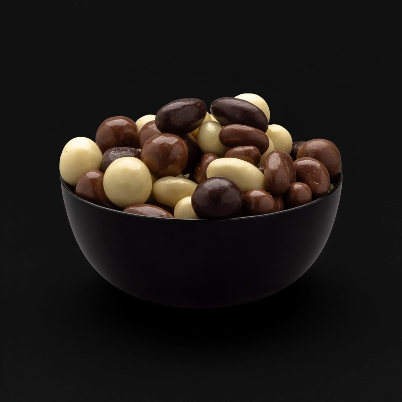 Een luxe mix van noten, waaronder amandelen, hazelnoten en cashewnoten, omhuld met een laagje melk-, pure of witte chocolade. Deze chocolade notenmix is ideaal voor een verwenmoment of om te delen met vrienden en familie.